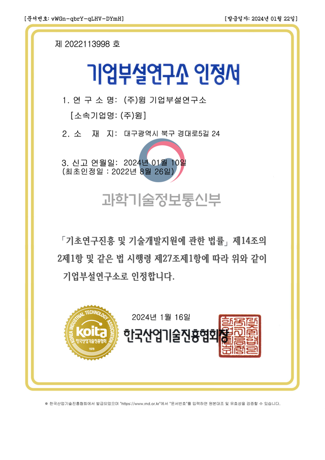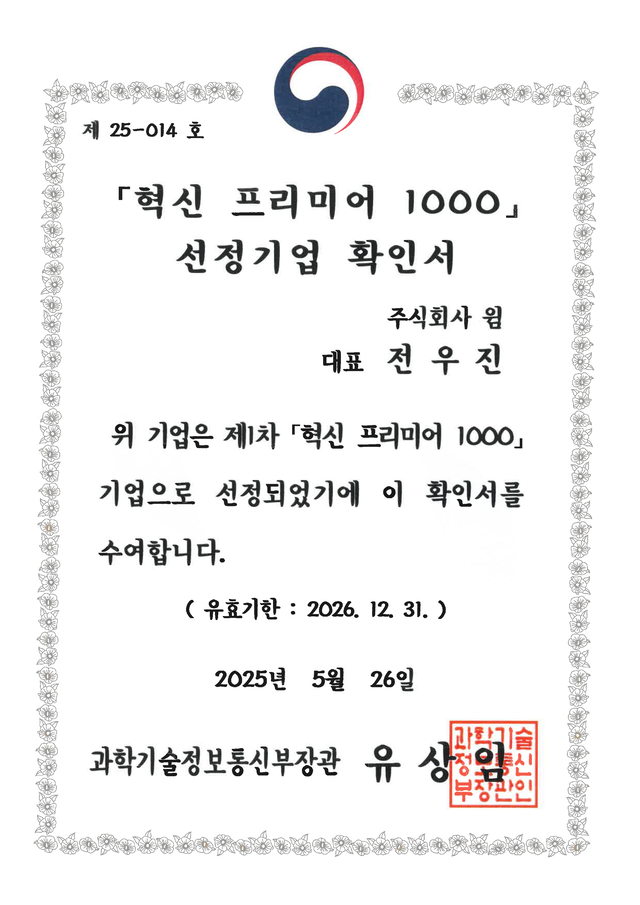 Selected as an Innovative Premier 1000 Company by the Ministry of Science and ICT